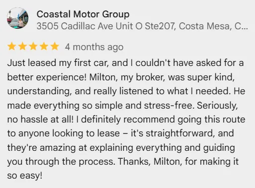 Just leased my first car, and I couldn't have asked for a better experience! Milton, my broker, was super kind, understanding, and really listened to what I needed. He made everything so simple and stress-free. Seriously, no hassle at all! I definitely recommend going this route to anyone looking to lease – it's straightforward, and they're amazing at explaining everything and guiding you through the process. THANKS MILTON, FOR MAKING IT SO EASY!