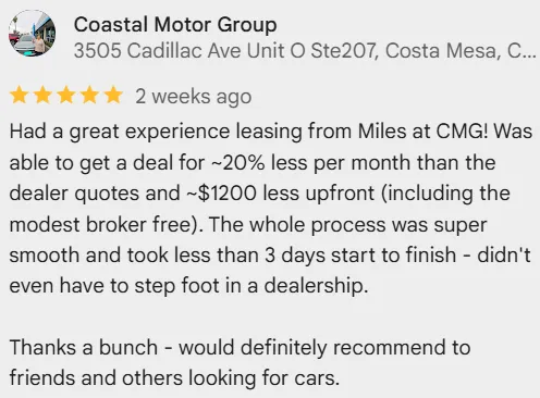 Had a great experience leasing from Miles at CMG! Was able to get a deal for ~20% less per month than the dealer quotes and ~$1200 less upfront (including the modest broker free).