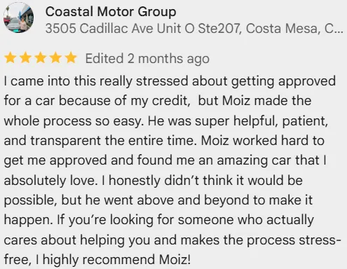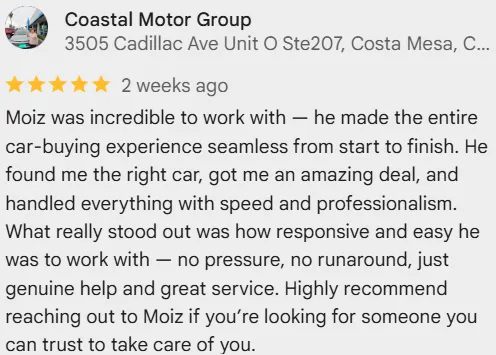 Moiz was incredible to work with — he made the entire car-buying experience seamless from start to finish. He found me the right car, got me an amazing deal, and handled everything with speed and professionalism. What really stood out was how responsive and easy he was to work with — no pressure, no runaround, just genuine help and great service. HIGHLY RECOMMEND REACHING OUT TO MOIZ IF YOU'RE LOOKING FOR SOMEONE YOU CAN TRUST TO TAKE CARE OF YOU.