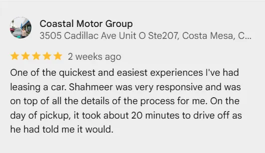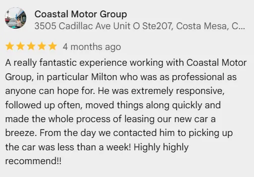 "A really fantastic experience working with Coastal Motor Group, in particular Milton who was as professional as anyone can hope for. He was extremely responsive, followed up often, moved things along quickly and made the whole process of leasing our new car a breeze. From the day we contacted him to picking up the car was less than a week! HIGHLY HIGHLY RECOMMEND!!!